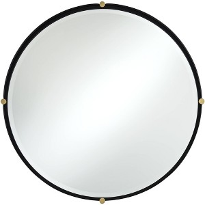 Beveled glass adds refined flair to a modern round wall mirror. Designed by Uttermost, it's a superb choice to bring designer style in your living area or bedroom, complete with a matte black finish strap-style frame. Four medallions of antique gold add warmth and character, perfect for traditional or contemporary decor.