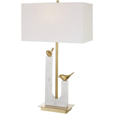 Exotic vibes make the relic contemporary table lamp an excellent choice. A ring silhouette with an open, airy presence delivers a fresh look in antiqued gold finish polyresin. This compelling table lamp designed by John Kowalski for Uttermost is an outstanding choice for an updated room with simple elegance. A black marble base and hand-carved textured dark bronze finish iron accents double down on an earthy feel.