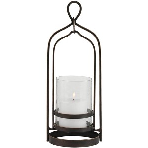 A teardrop handle adds character to a modern Moroccan style candleholder from Uttermost. Perfect for a sunroom or covered patio, it features an intricate metal frame that receives a dark bronze finish with gold rub-through that creates a sense of age and character. At the center is a textured glass hurricane, and this candleholder includes one candle so it's ready to go right away.