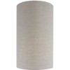 - Tall hardback drum shade in textured khaki linen adds warmth and depth