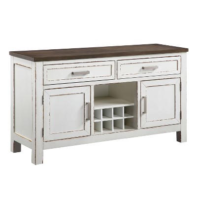 To those with an appetite for rustic farmhouse living, this server dishes out irresistible form and function. Pair of cabinet doors with mesh wire inlays add a countrified cool element. Sliding "barn doors" revealing even more shelved storage are right on trend. This server’s two-tone aesthetic pairs a distressed vintage white with an aged natural pine color top for twice the charm. Signature Design by Ashley is a registered trademark of Ashley Furniture Industries, Inc..