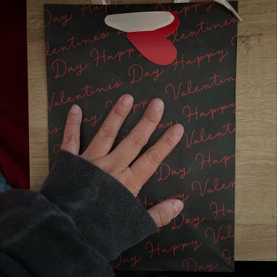 - DESIGN & FINISHINGS: This medium Valentine's Day gift bag features 'Happy Valentine's Day' repeated in elegant red script on a chic black background.