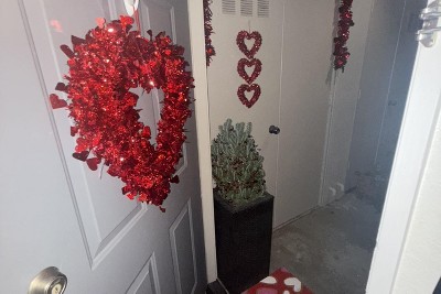 A: The doormat showcases an allover hearts design in white and pink, perfect for Valentine's Day.