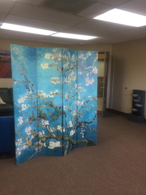 Bring a dramatic splash of color and some fine art appreciation into any interior with the Van Gogh Fine Art Double Sided Room Divider Almond Blossoms and Wheat Field from Oriental Furniture, a 4-panel decorative screen that stretches 6' high and displays 2 Vincent Can Gogh masterpieces: "Almond Blossoms" and "Wheat Field," 1 a breathtaking landscape painting, the other a striking still life.
