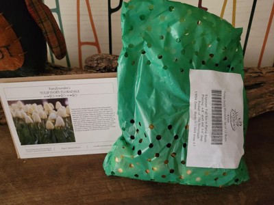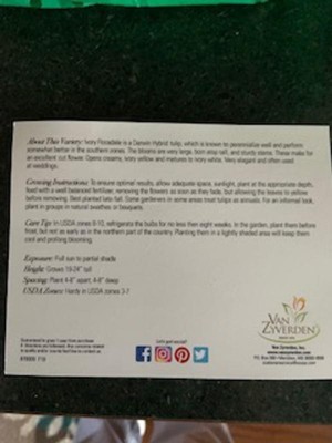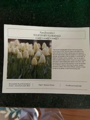 [This review was collected as part of a promotion.] The Floradale tulip bulbs look fresh, firm, and healthy. They are labeled product of the Netherlands, so the best quality. I am in Zone 7 and am excited that these bulbs are supposed to perform well in the south. It is fall here and I just planted. The bulbs come with easy planting instructions and I find tulips very quick to get into the ground, so it is an easy addition to the garden. The ivory color will complement any other color flower or garden layout, so I planted among some pink tulips that I already had with an eye toward the recommended spacing for these large flowers. I look forward to seeing them all come up together in spring. The Floradale is a huge flower and I cannot wait to see it come back year after year. It will be great for cutting and making handmade bouquets for my vases.