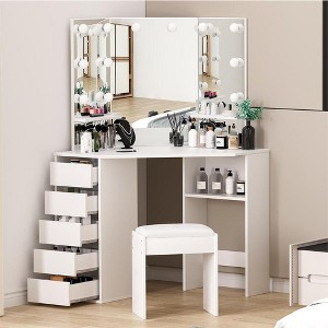 Vanity Desk with Mirror and Lights, Corner Makeup Vanity Desk, Large Dressing Tables with Charging, 5 Drawers, Shelves and Vanity Stool