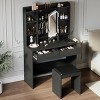 - 【Ample Storage Space】 This 35.43 inW x 15.75 inD x 57.09 inH (90x40x145cm), 72.75 LB (33 kg) vanity desk features a flip-open mirror with hidden storage, 2 deep drawers, 4 open side shelves, and a spacious desktop with a padded stool. It provides abundant organized space for cosmetics, jewelry, hair dryers, curlers, and essentials, making it a functional vanity dresser. The oversized drawers offer easy visibility and quick access, even during rushed mornings.