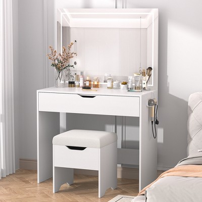 Vanity Desk with Mirror and Lights, Makeup Table with Chair, Power Outlet, Hair Dryer Rack, 7 Drawers, 3 Lighting Modes, Bedroom Set, Marble White