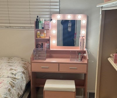 This is super cute for my 10 year old daughter. I also use it sometimes as well. Not extremely difficult to put together but there are a lot of pieces. I gave four stars because one of the draws is slightly crooked but for the price this was a steal! It’s perfect for a child. There’s two drawers with decent storage. The lights change colors too, with a dimmable feature and on and off switch. The stool is sturdy and easily fits underneath. My daughter absolutely loves it!