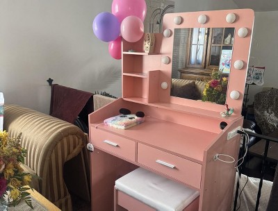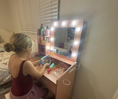 We ordered this for my daughter for her 9th birthday. My husband unboxed and assembled it when I wasn't home. The color is coral pink, not the light pink shown. It will not match her room. I didn't want to make my husband feel bad after he put it together, so we will keep it. The bench is also completely different than pictured. If you don't mind the color being coral, it's a nice vanity. My daughter is happy with it and it's a good size she can use for many years to come.