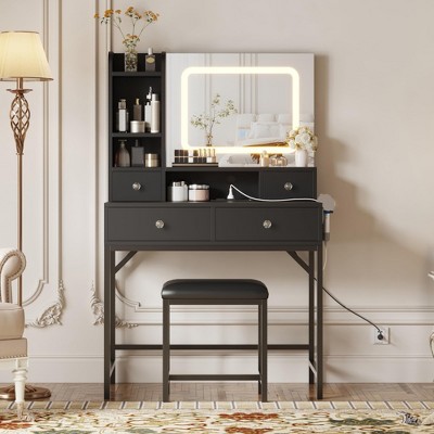 Vanity Desk with Mirror, LED Lights and Power Outlet Makeup Table with 3 Drawers and Storage Shelves Dressing Table