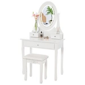 The vanity exemplifies commitment to elegance, functionality, and a touch of luxury that elevates everyday spaces into extraordinary environments.Vanity is both practical and fashionable, the spacious storage configuration provides enough space for your cosmetics and jewelry, also a good choice for giving gifts!Feature:Enjoy the elegant and functional vanity!Classic oval mirror adds elegance to your home.360° rotating mirror ensures a complete makeup experience.Removable top mirror easily converts the vanity into a writing desk.8 LED bulbs with 3 adjustable colors provide optimal lighting.2 small drawers and a large drawer offer ample storage space.Compact vanity measuring 29.53" x 15.75" x 55.12" fits in small spaces.Cushioned stool adds comfort for extended use. Specification:Material: MDFVanity Size: 29.53” x 15.75” x 55.12”Stool Size: 15.75” x 10.63” x 17.32”Packing list:1 x Vanity1 x Stool1 x Hardware Pack1 x Instruction ManualNote:Please follow the installation instructions step by step. Before starting, make sure you have all the parts you need.Refrain from placing heavy items or applying excessive pressure on the vanity to prevent deformation or damageUse a soft damp cloth to gently wipe the surface.