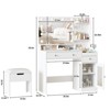 This upgraded vanity table set features a built-in charging station with 2 standard plugs and 2 USB ports, allowing easy use of hair tools and device charging. With a spacious desktop, large drawer, small drawer, 3 compartments, glass-door cabinet, hair dryer rack, and under-stool storage, it offers super-large capacity. The glass door and 5 necklace hooks under the shelf add convenience and elegance. The large mirror with 10 LED bulbs has 3 lighting modes (warm yellow, natural, bright white) and adjustable brightness. Sized 39.8(W)*15.7(D)*53.6(H)in, it includes anti-tip device for safety, and easy assembly with labeled parts.
