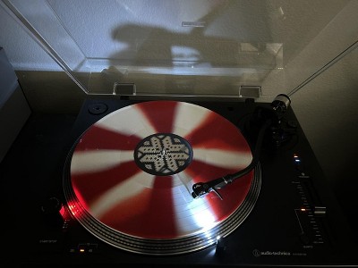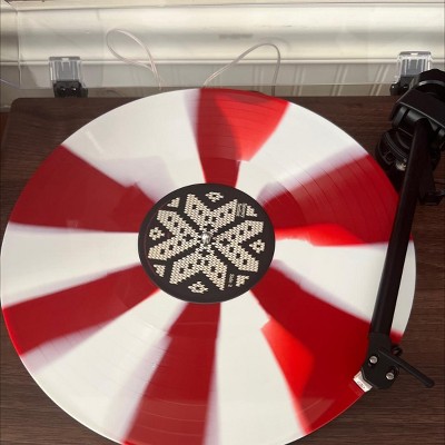 - Pressed on festive peppermint candy color vinyl.
