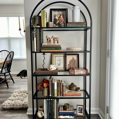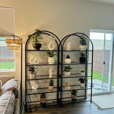 This is simply amazing! It was easy to install and took me alone about 45 min. It is the way more affordable option to the trendy arch bookcases/cabinets. I like how I’m able to see everything from displaying decorative pieces to books.