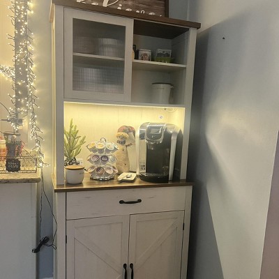 - [Storage Aplenty] This kitchen pantry cabinet features a top compartment with a translucent sliding door, a roomy countertop, a large drawer, and a bottom cabinet, providing ample space to neatly organize your various kitchenware and coffee essentials