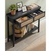 - [Ample Storage] Maintain an organized space with this narrow entryway table. It features a large tabletop to perch your often-used items or display decorations, 2 big drawers to tuck away private items, and an open shelf for shoes or storage baskets