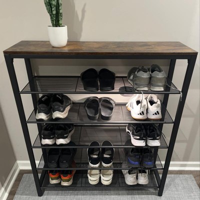 - [Stylish & Durable] Constructed with particleboard and steel in a rustic brown and black finish, this shoe organizer combines durability with an attractive aesthetic for any living space
