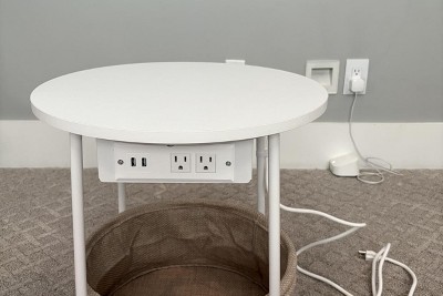 Upgrade your living space with this versatile Round LED Side Table, featuring a convenient charging station with power outlets and USB ports for effortless device charging. The built-in LED light adds a modern touch, while the spacious fabric basket offers extra storage for blankets, books, or essentials. Crafted with a sleek, contemporary design, this multi-functional, living rooms, or offices. Durable and stylish, it combines practicality with elegance to complement any modern decor. Material: Particleboard, Steel, Polyester Fabric Product Size: 17.7"Dia. x 19.7"H (45 x 50 cm) Basket Size: 15.6"Dia. x 7.2"H (39.6 x 18.2 cm) Product Weight: 10.2 lb (4.6 kg) Max. Static Load Capacity of Tabletop: 77 lb (35 kg)