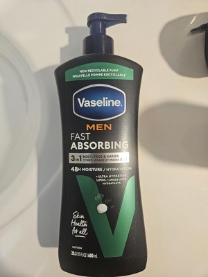 - NON-GREASY FEEL: Vaseline® Men Fast Absorbing Body Lotion absorbs into your skin in 15 seconds to provide immediate moisturization without making your skin feel greasy.