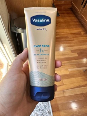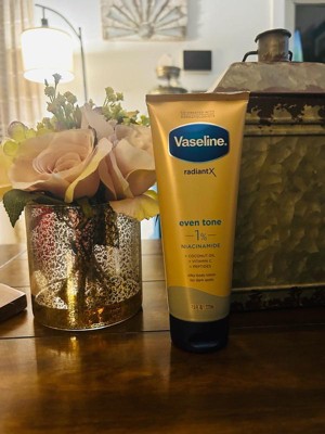 [This review was collected as part of a promotion.] [This review was collected as part of a promotion.] I received a tube of Vaseline Radiant X Even Tone Body Lotion, courtesy of Influenster. I must say that the scent is ABSOLUTELY DIVINE!!! With the addition of the coconut oil, one sniff transports me to a tropical paradise every time. The blend of coconut oil, niacinamide, vitamin C, and peptides is a combination of skin-loving ingredients that creates a glow-boosting factor. I love that this is a silky body lotion that goes on smoothly, is non-greasy, and absorbs quickly, leaving your skin soft and hydrated. Even if using it all over, you don't need too much. Just a little goes a long way. This product claims to be backed by clinical studies proven to visibly reduce dark spots and even skin tone in just 14 days. While I haven't used it long enough to determine the efficacy of this product I plan to continue using it consistently, in my skincare routine, to see if it makes my skin tone even. I cannot wait to see if there's a difference. I've always loved and trusted the Vaseline brand, so I'm hoping to achieve great results.