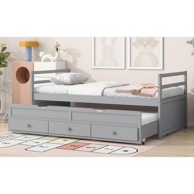 VASIP Twin Size Pine Wood Bed with Trundle and 3 Storage Drawers ,Space-Saving Design for Kids' Room & Guest Room,Gray