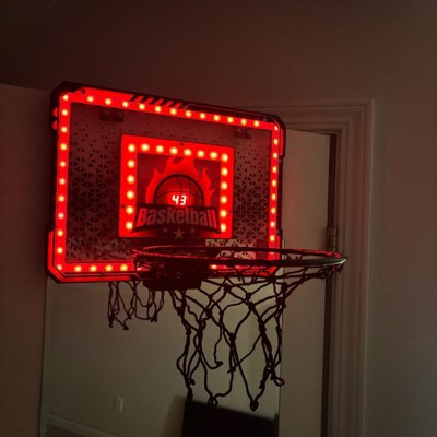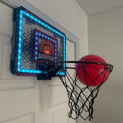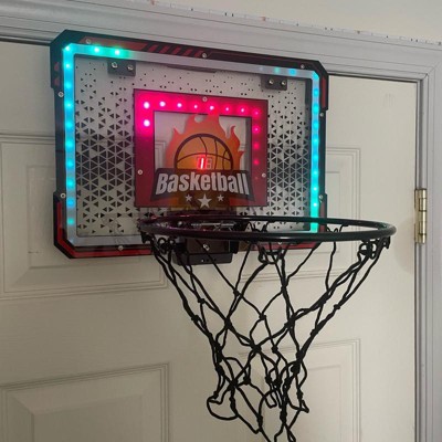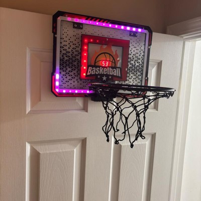[This review was collected as part of a promotion.] This is a pretty cool basketball set up. It was able to be put together by a kid so it wasn’t too extremely difficult and it fits over the door with door guards to protect the door. It does take a couple AA batteries that were not included for the LED lights to work. Also there is a button battery included for the remote. It was fun to see it light up and keep track of the score. There’s about 5 different modes You can put it in for playing . It came with three balls that you have to inflate and a little pump to do so . Really fun toy.