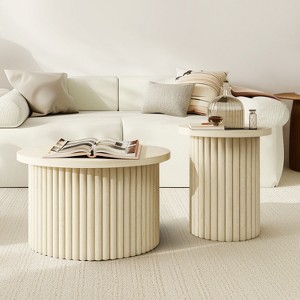 Elevate your living space with this versatile round coffee table set, featuring a large and small table that can be used together or separately for endless styling options. Designed with unique vertical wood grain legs, this set combines modern elegance with exceptional stability. Its classic color seamlessly integrates into any decor, while thoughtful details like rounded corners and non-slip foot pads ensure safety and floor protection. Perfect for modern living, this set offers both functionality and style.