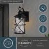 Collection: Adams, Material: Steel, Finish Color: Black, Width: 5.5", Height: 12", Depth: 6.75", Height From Outlet Box: 4.5", Backplate Width: 4.72", Backplate Length: 4.72", Lamping Type: Incandescent, Number Of Bulbs: 1, Wattage: 60 Watts, Dimmable: Yes, Moisture Rating: Wet Rated, Desc: The Adams collection brings a lighthearted style to a traditional lantern. Cylindrical seeded glass is topped off with a strong black cap, as it hangs from a solid curved hook. Slim black lines crisscross around the glass drawing the eye up and around its shape. This outdoor wall light is ideal for your porch, entryway, garage, or any other area of your home. Dusk to dawn photo cell automatically turns fixture on in the dark and off in the light for added safety and security, saving energy during daylight hours / Weather resistant steel material provides long lasting durability / Clear seeded glass provides bright illumination and a traditional feel / Uses 1 x 60 watt E26 medium base bulb (not in