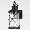 Collection: Adams, Material: Steel, Finish Color: Black, Width: 6.5", Height: 13.75", Depth: 8.25", Height From Outlet Box: 5.75", Backplate Width: 4.72", Backplate Length: 4.72", Lamping Type: Incandescent, Number Of Bulbs: 1, Wattage: 60 Watts, Dimmable: Yes, Moisture Rating: Wet Rated, Desc: The Adams collection brings a lighthearted style to a traditional lantern. Cylindrical seeded glass is topped off with a strong black cap, as it hangs from a solid curved hook. Slim black lines crisscross around the glass drawing the eye up and around its shape. This outdoor wall light is ideal for your porch, entryway, garage, or any other area of your home. Dusk to dawn photo cell automatically turns fixture on in the dark and off in the light for added safety and security, saving energy during daylight hours / Weather resistant steel material provides long lasting durability / Clear seeded glass provides bright illumination and a traditional feel / Uses 1 x 60 watt E26 medium base bulb (no