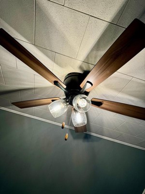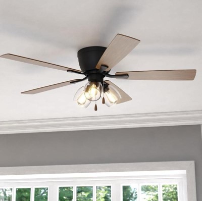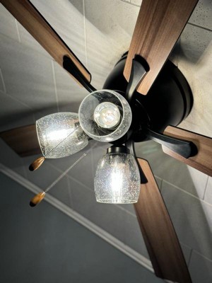 The Brayton ceiling fan in a black finish is transitional styling with a modern look and good value price. The light kit features three distinct clear seeded glass shades and includes clear LED bulbs. Attractive reversible black or dark oak blades allow you to coordinate with any decor. A pull chain makes it easy to control the three speeds. The flush mount motor housing is ideal for low ceilings and standard height rooms. This fan is perfect for your living room, bedroom, kitchen, or home office. Can be alternatively installed without the light kit.