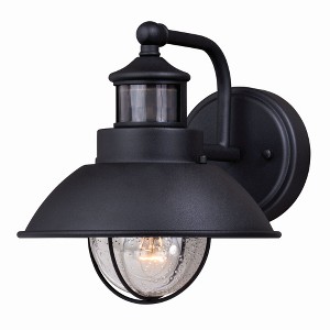 Collection: Harwich, Material: Steel, Finish Color: Textured Black, Width: 6", Height: 10.5", Depth: 7.25", Height From Outlet Box: 4", Backplate Width: 4.5", Backplate Length: 6", Lamping Type: Incandescent, Number Of Bulbs: 1, Wattage: 60 Watts, Moisture Rating: Wet Rated, Desc: An iconic nautical-style design, the Harwich collection will bring a coastal New England feel to your home's exterior. Dualux dual-level outdoor security lighting is designed to fit your lifestyle and enhance the beauty, safety, and usability of your home's exterior areas. Enjoy the comfort and convenience of continuous bright illumination during the early evening hours with automatic dimming late at night to provide soft, ambient illumination until dawn. Rest assured knowing that whenever motion is detected, on-demand bright illumination will be triggered to keep your property safe and secure. This fixture works with any dimmable incandescent or halogen bulb and many dimmable LED bulb models. You get conven