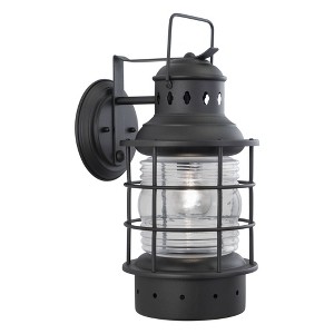 Collection: Hyannis, Material: Steel, Finish Color: Textured Black, Width: 15", Height: 12.25", Depth: 23", Height From Outlet Box: 5.25", Backplate Width: 4.72", Backplate Length: 4.72", Lamping Type: Incandescent, Number Of Bulbs: 1, Wattage: 100 Watts, Dimmable: Yes, Moisture Rating: Wet Rated, Desc: A traditional nautical lantern, the Hyannis takes a classic style and makes it better. It features sturdy steel construction with multiple finish options and clear glass. Experience this coastal look for yourself. It is sure to be a great addition to your homes exterior decor. Ideal for your porch, entryway, garage, or any other area of your home. Assembly Required: Yes / Back Plate Height: 4.72 / Back Plate Width: 4.72 / Bulb Shape: A19 / Dimmable: Yes / Shade Included: Yes. ,
