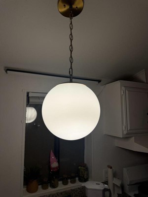 The Linden 12-in. globe pendant seamlessly marries mid-century modern allure with contemporary sophistication, boasting a stunning composition of frosted opal glass and muted brass finish. It effortlessly complements today's hottest decor trends and serves as a captivating centerpiece that casts an inviting glow in your foyer, kitchen, or bedroom.
