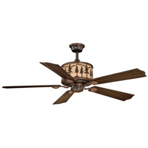 Evoking the spirit of the wilderness, this rustic themed ceiling fan is clad in a burnished bronze finish and features silhouetted tree imagery atop glowing amber flake glass. It a great choice for a vacation lodge, cabin or a suburban home - it will complement a variety of home styles: anywhere you want to bring an element of nature. Add a light kit (sold separately) to brighten up your space. This fan is compatible with sloped ceilings and includes a 6 inch down rod (longer down rods sold separately). Remote control included for Live convenience. Blades are reversible; choose between rosewood and dark walnut. Unique lighted motor housing with energy saving LED bulbs (included).