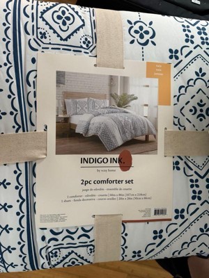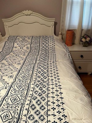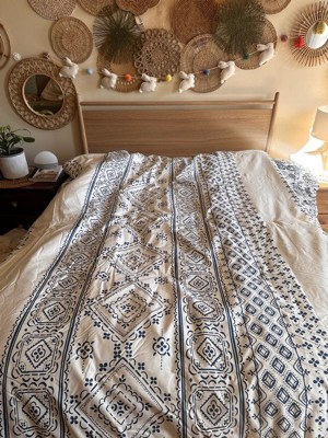 Give your bedroom a breezy, bohemian feel with the Denim Geometric Stripe Comforter Set. An eye-catching addition to your main bedroom, guest room, or dorm décor, this globally inspired boho bedding features navy blue geometric patterned stripes on crisp white fabric. Each coordinated bed set includes a printed comforter and matching pillow shams (one sham in the Twin set) to complete the look. You can keep this bohemian bed set looking and feeling fresh by machine washing it gently and separately in cold water with similar colors and tumble drying on a low setting as needed.
