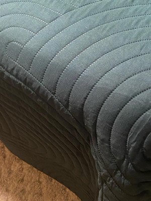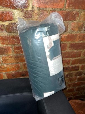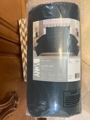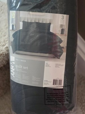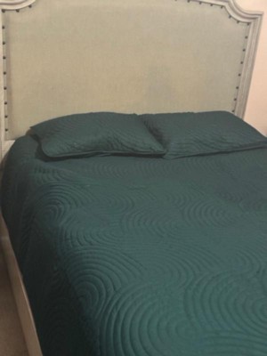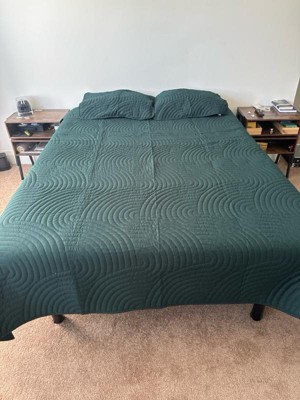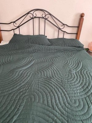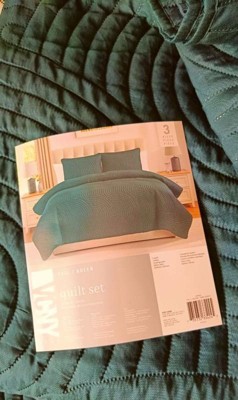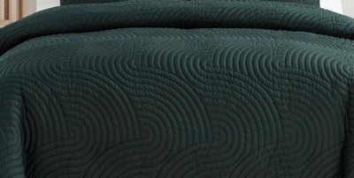 [This review was collected as part of a promotion.] The VCNY Sands Quilt Set comes in a poly bag. The 3-piece set includes a quilt and 2 standard size shams. The set I received is a size full/queen (90x90) with two 21x27 inch shams in dark green. The green color is very deep, almost bordering on being black. The design that is stitched in is a very neutral yet still fancy wave pattern. Both the quilt and the shams have the stitched pattern on them. The quilt is the perfect size for either a longer length full bed or a shorter length queen bed. I like the thickness of the quilt; it's perfect for spring or fall when the temperature is not too hot or too cold. I would recommend this quilt to family and friends.