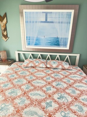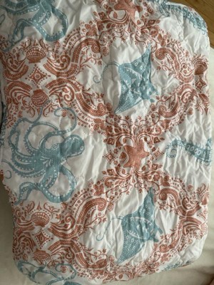 Give your bedroom decor a relaxed, beachy feel with the VCNY Home Coastal 3-Piece Coral/Seafoam Green Printed Sealife Quilt Set. A cozy addition to your coastal décor, this printed quilt set features seahorses, crabs, and sea life-themed designs in classic coral and seafoam green colors. This 3-piece bed set includes a quilt and coordinating shams to complete the look. You can keep this VCNY Home bed set looking fresh by machine washing it in cold water with similar colors and drying it on a low setting as needed.