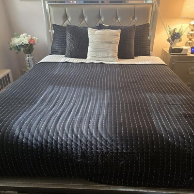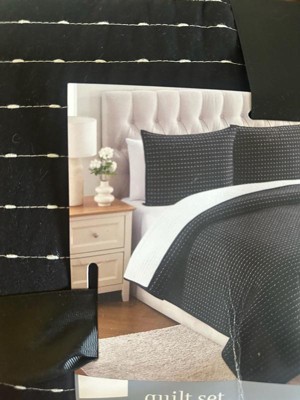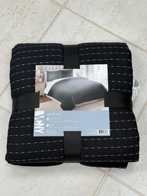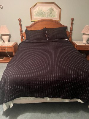[This review was collected as part of a promotion.] Black 3 piece quilt set. Texture and embroidery/stitch of the set looks great. Kind of a modern take on quilts. Fits a queen bed just fine. My only gripe is the comfort level. Feels ok with the embroidery texture but could be softer.