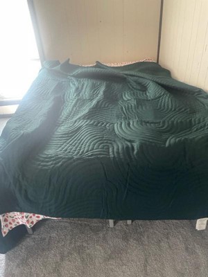 [This review was collected as part of a promotion.] The VCNY Sands Quilt Set comes in a poly bag. The 3-piece set includes a quilt and 2 standard size shams. The set I received is a size full/queen (90x90) with two 21x27 inch shams in dark green. The green color is very deep, almost bordering on being black. The design that is stitched in is a very neutral yet still fancy wave pattern. Both the quilt and the shams have the stitched pattern on them. The quilt is the perfect size for either a longer length full bed or a shorter length queen bed. I like the thickness of the quilt; it's perfect for spring or fall when the temperature is not too hot or too cold. I would recommend this quilt to family and friends.