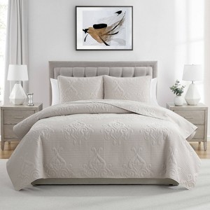 Add timeless style and supreme comfort to your bed with the VCNY Home Solomun 3-Piece Pinsonic Damask Microfiber Quilt Set. Available in several solid colors, this lightweight quilt set features pinsonic textured damask designs and soft wash microfiber fabric that strikes the perfect balance between cozy and durable. This 3-piece bed set includes a quilt and coordinating pillow shams to complete the look. You can keep this bed set looking and feeling fresh by machine washing it in cold water and drying it on a low setting.
