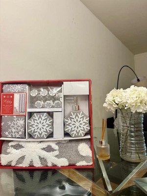 Escape into a winter wonderland with the VCNY Home 16-Piece Snowflake Holiday Shower Curtain Bath Set, perfect for your primary bathroom or guest bath décor. This festive winter bath set features a flurry of white snowflakes on a grey background for a timeless look. The 16-piece coordinated bath set has everything you need for a winter makeover – a shower curtain, decorative snowflake shower hooks, a tufted bath rug, and a snowflake-shaped soap dispenser and tumbler to complete the look. Pair the fabric shower curtain with your favorite waterproof shower liner (not included).