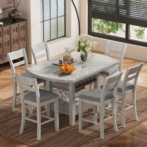 This dining set features a rustic country style that complements a variety of decor styles and enhances the overall beauty of the space. The set includes a dining table and six upholstered dining chairs that provide ample seating for family and friends. The dining table with foldable table leaf gives you the freedom to adjust the size of the table to suit different occasions. Whether you are hosting a small family dinner or a large gathering, this dining set is perfect. A large, spacious drawer, a built-in wine bottle display and shelves underneath the dining table keep essentials within reach while keeping the space tidy. The sturdy rubber wood plank tabletop is adorned with a beautiful wood-grain veneer, while the eye-catching chairs are made of solid rubber wood for durability. The surface is water and stain resistant, making cleaning a breeze.