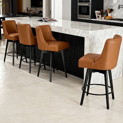 VECELO stylish and practical bar stool set can easily upgrade your kitchen or dining space. You can choose between cream-colored diamond-patterned fabric or brown faux leather swivel bar stools, both featuring curved wooden armrests for enhanced comfort and style. These bar stools with backrests and armrests feature a sturdy steel base and 360-degree swivel functionality, allowing you to easily reach for items or chat with friends without standing up, turning around, or moving frequently. The spacious 17.91¡± seat cushion and integrated footrest design provide a comfortable seating experience whether you're enjoying coffee at your home bar or entertaining guests. Available in convenient 2-piece and 4-piece bar stool sets, each set is packaged in a compact two-piece box for easy delivery and installation. These modern kitchen bar stools are designed to seamlessly integrate into any environment, from bar counters to kitchens, making them an ideal choice for various counter-height bar stool applications.