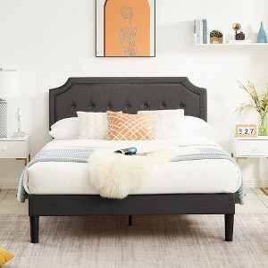 - [HIGH QUALITY MATERIAL DECORATION] This upholstered bed frame features a high-quality decorative headboard, which is set in a durable metal and wood frame with slats. It is comfortable, breathable and not easy to get damp, you can use it with confidence.