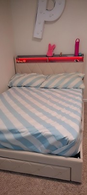 I had been looking to upgrade my daughter's room with a full size bed. My daughter absolutely loves her new bed because of its soft velvet fabric, cool LED lights which she can easily manage with a remote (included) and it has ample storage space to keep her toys and clothes and it has a charging station too!! Easy to assemble with clear instructions. Go for this Vecelo upholstered, sturdy platform bed to upgrade your space!!