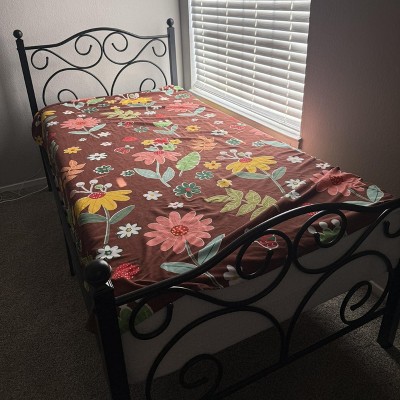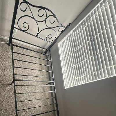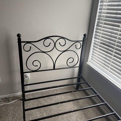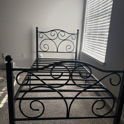 Transform your bedroom or spare room with this sophisticated scroll metal bed frame. It features a beautiful metal scroll design on the headboard and footboard, creating a romantic ambiance in your home. Made of solid and durable metal, this bed frame has multiple support legs for stability. Thanks to the metal slatted structure, you can use it with various types of mattresses without needing a bulky box spring. The bed also has 12.6 inches of clearance underneath, providing extra storage space.