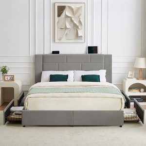 Elevate your bedroom with this luxurious velvet upholstered bed frame, designed for the modern sleeper who values both style and functionality. The smart headboard features built-in USB charging ports on each side, keeping your devices powered and within easy reach.Storage is a breeze with four spacious under-bed drawers on wheels, providing ample space for organizing clothes, extra bedding, and more. This feature is especially valuable for small bedrooms or those looking to maximize their bedroom storage.The bed's robust construction includes 12 heavy-duty metal slats and 9 reinforced legs, supporting up to 1100 lbs without the need for a box spring. This platform bed design ensures durability and stability for years to come. The noise-free technology, utilizing EVA foam, guarantees a peaceful night's sleep by reducing movement sounds.The tufted headboard, upholstered in soft velvet fabric with high-resilience memory foam, adds a touch of luxury to your bedroom while providing comfortable support for reading or watching TV in bed. Choose from multiple sizes (King, Queen, Full) and colors (light grey, dark grey, beige) to perfectly complement your bedroom decor.Whether you're furnishing a master suite, guest room, or small apartment, this velvet platform bed frame offers the ideal combination of style, comfort, and practicality. Transform your sleeping space into a cozy retreat with this modern, multifunctional bed that caters to all your rest and storage needs.