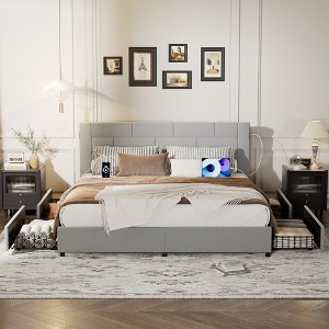 Elevate your bedroom with this luxurious velvet upholstered bed frame, designed for the modern sleeper who values both style and functionality. The smart headboard features built-in USB charging ports on each side, keeping your devices powered and within easy reach.Storage is a breeze with four spacious under-bed drawers on wheels, providing ample space for organizing clothes, extra bedding, and more. This feature is especially valuable for small bedrooms or those looking to maximize their bedroom storage.The bed's robust construction includes 12 heavy-duty metal slats and 9 reinforced legs, supporting up to 1100 lbs without the need for a box spring. This platform bed design ensures durability and stability for years to come. The noise-free technology, utilizing EVA foam, guarantees a peaceful night's sleep by reducing movement sounds.The tufted headboard, upholstered in soft velvet fabric with high-resilience memory foam, adds a touch of luxury to your bedroom while providing comfortable support for reading or watching TV in bed. Choose from multiple sizes (King, Queen, Full) and colors (light grey, dark grey, beige) to perfectly complement your bedroom decor.Whether you're furnishing a master suite, guest room, or small apartment, this velvet platform bed frame offers the ideal combination of style, comfort, and practicality. Transform your sleeping space into a cozy retreat with this modern, multifunctional bed that caters to all your rest and storage needs.