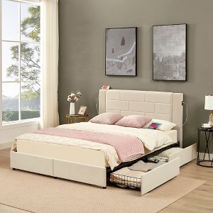 Elevate your bedroom with this luxurious velvet upholstered bed frame, designed for the modern sleeper who values both style and functionality. The smart headboard features built-in USB charging ports on each side, keeping your devices powered and within easy reach.Storage is a breeze with four spacious under-bed drawers on wheels, providing ample space for organizing clothes, extra bedding, and more. This feature is especially valuable for small bedrooms or those looking to maximize their bedroom storage.The bed's robust construction includes 12 heavy-duty metal slats and 9 reinforced legs, supporting up to 1100 lbs without the need for a box spring. This platform bed design ensures durability and stability for years to come. The noise-free technology, utilizing EVA foam, guarantees a peaceful night's sleep by reducing movement sounds.The tufted headboard, upholstered in soft velvet fabric with high-resilience memory foam, adds a touch of luxury to your bedroom while providing comfortable support for reading or watching TV in bed. Choose from multiple sizes (King, Queen, Full) and colors (light grey, dark grey, beige) to perfectly complement your bedroom decor.Whether you're furnishing a master suite, guest room, or small apartment, this velvet platform bed frame offers the ideal combination of style, comfort, and practicality. Transform your sleeping space into a cozy retreat with this modern, multifunctional bed that caters to all your rest and storage needs.